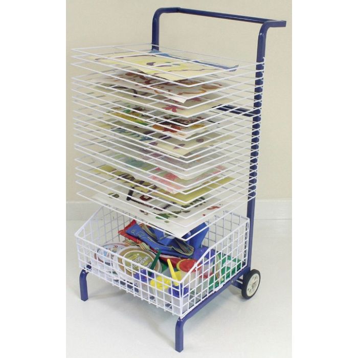 A sturdy metal trolley supplied with 20 wire drying shelves and a storage basket. The trolley is supplied on 2 castors and is easy to move around the classroom. Frame L54cm x W45cm x H99.5cm. Rec 3+. Self-assembly.