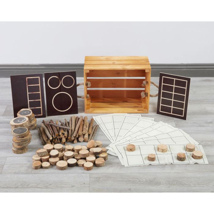 A treasure chest of maths tools: Packed with over 120 items, including wooden discs, sticks, and maths frames, this crate offers everything needed for EYFS numeracy games and activities.
