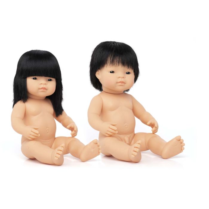 Very well-defined facial features help children identify the various races. Made of soft vinyl. Articulated head, arms and legs. Lightly vanilla-scented body. Sewn on hair. Anatomically correct dolls.