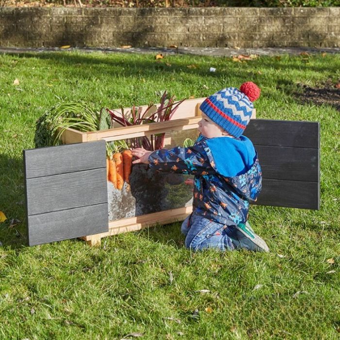 Children can open the doors and peek at the root systems, learning firsthand about plant parts and their functions.