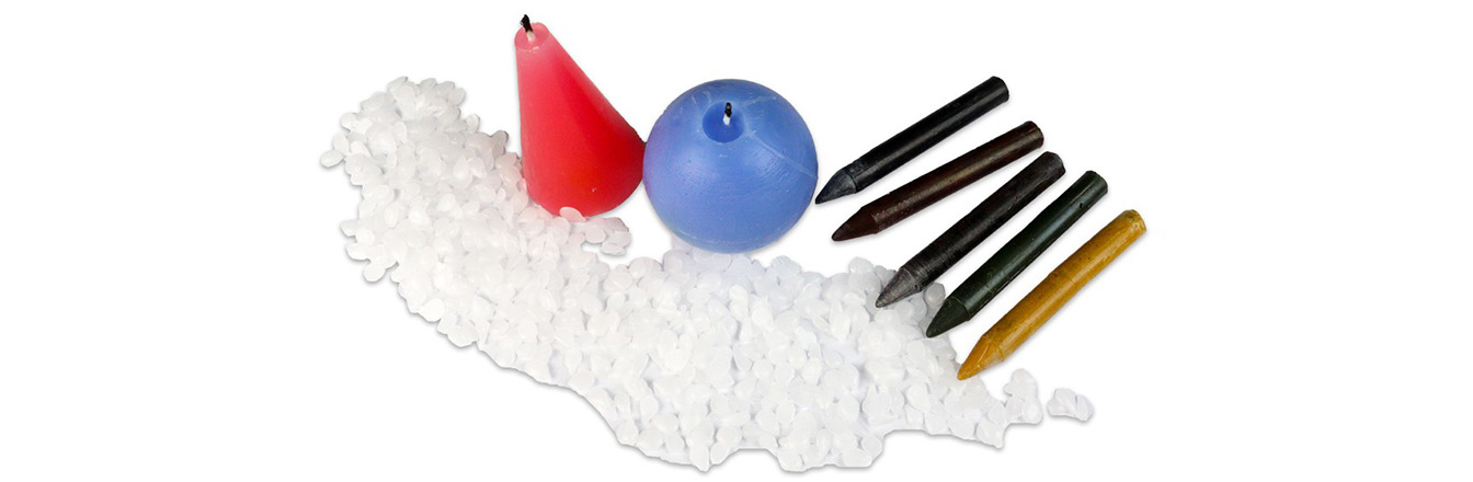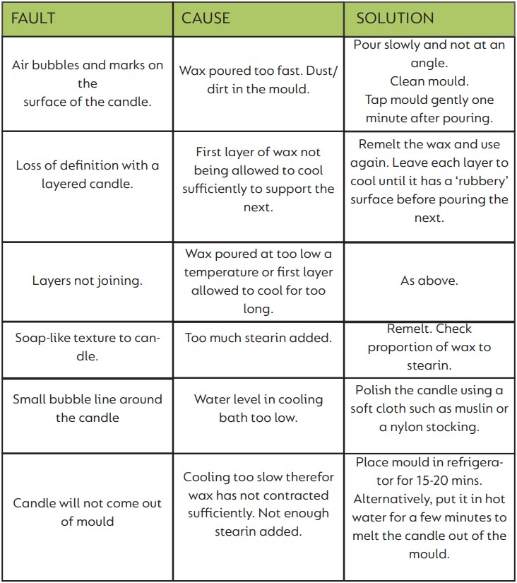 Stearic acid, commonly known as stearin, raises the melting point of the wax mixture resulting in a harder and more durable candle. Stearin can be made from vegetable oil or tallow, as a guide it’s best to use 10% stearin to 90% wax. The combination of paraffin wax and stearin has many benefits; not only will it give you a candle that won’t sag and will burn for a long time, but it is easier to de-mould as the mixture shrinks as it cools. Be on your guard when using stearin with latex or rubber moulds, as stearin can erode over time.