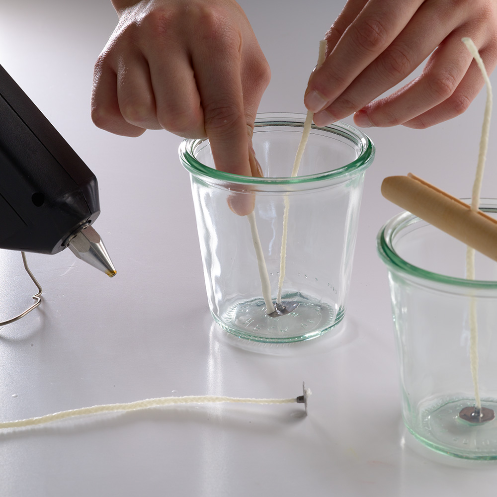 4. Using a glue gun, place a drop of glue into the centre of the base of the inside of your container, and place your wick sustainer with the wick in place. Use a stick or pen to poke it in place. The strength of the hot glue from the gun will hold it in place and stick it quickly.