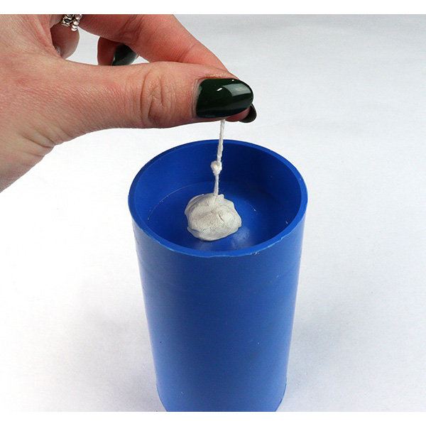 4. Then, using a wick holder, secure the wick to the open end of your mould, ensuring the wick is centred. You can buy wick holders, or use an item like a cocktail stick or a clothes peg. Your choice of wick holder will be dependent on the diameter of your candle. Tie your wick to the holder so that it is taut.