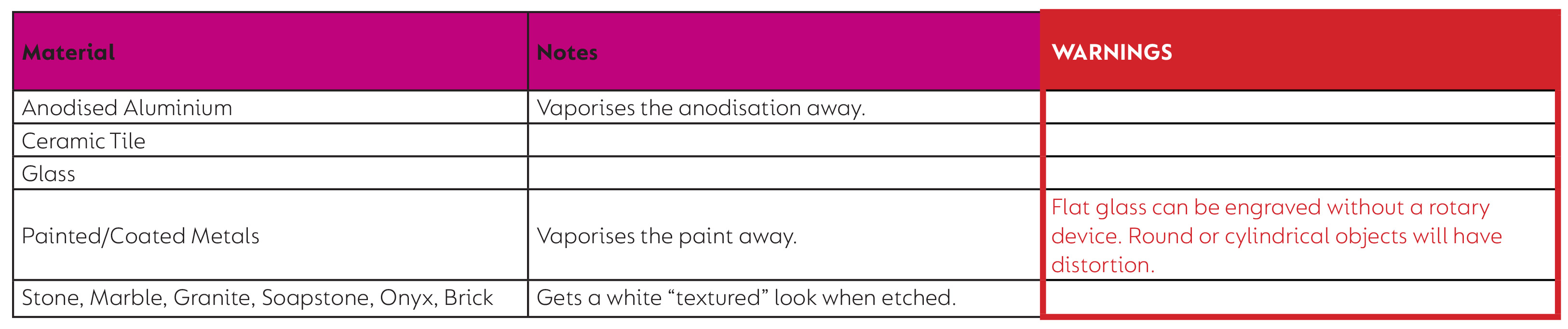 See the products in the tables below that are generally suitable for use with a CO₂ laser or engraving machine. Please note that laser machines can vary, so always check your machine’s manual to confirm which materials are safe, suitable, or unsafe for your specific setup. Always ensure proper ventilation when working with fumes.