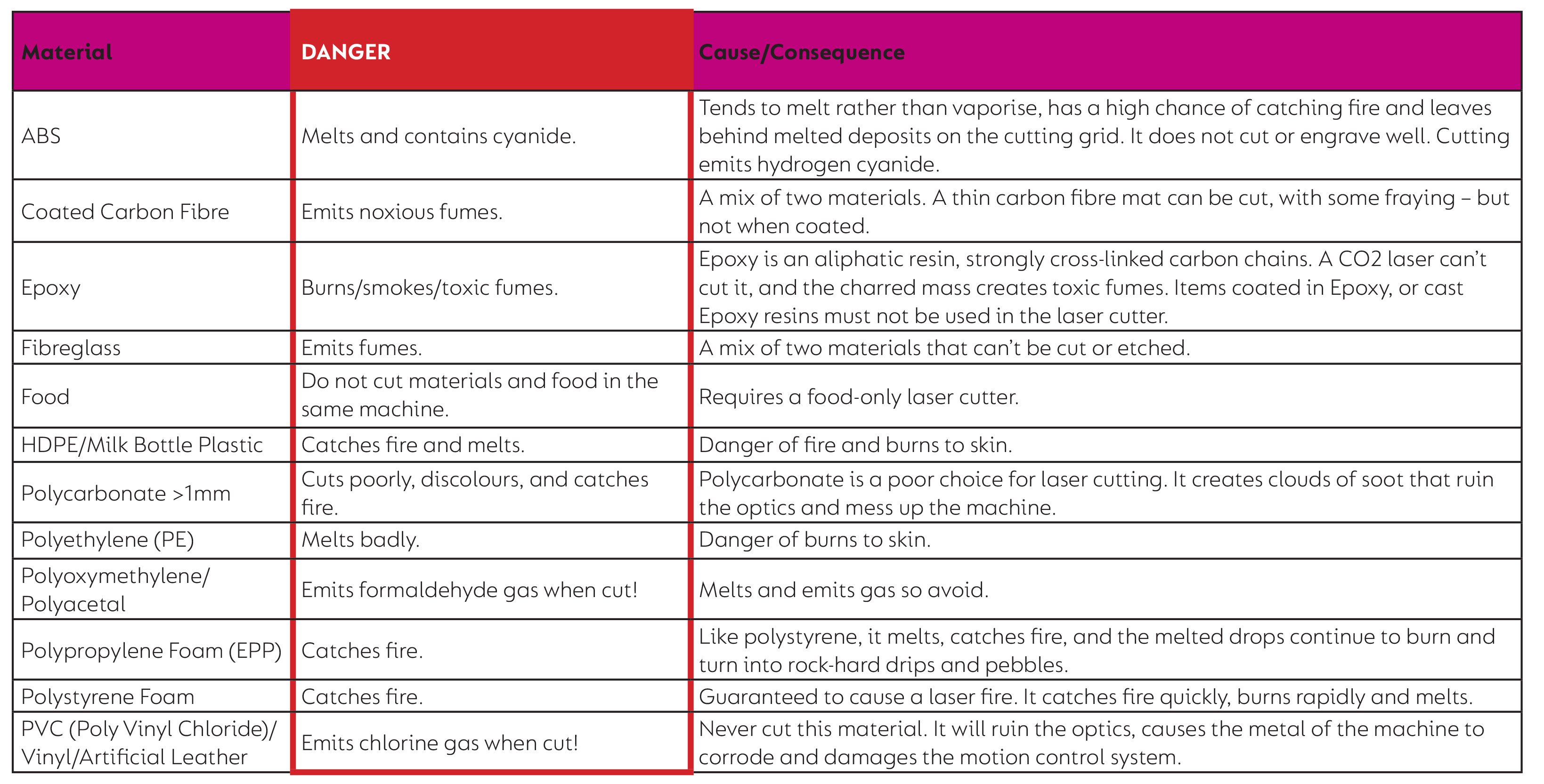 Unsafe Materials - DO NOT USE WITH LASER