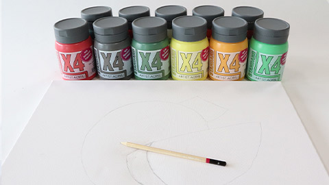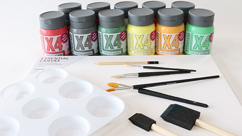 Prepare your workspace. You will need a mixture of brushes, a paint palette, a canvas or canvas board as well as shades of X4 Artist Acryl Paints.