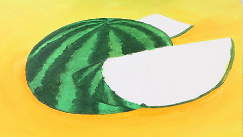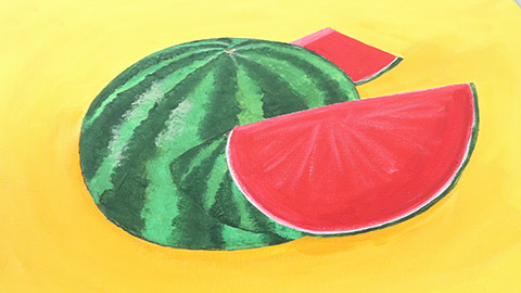 With a thin brush and white paint, paint a thin line above the watermelon skin. Then, using a mixture of red paints, paint the watermelon flesh. Once dry, lightly use a foam brush dipped in white paint to create detailing on the melon.