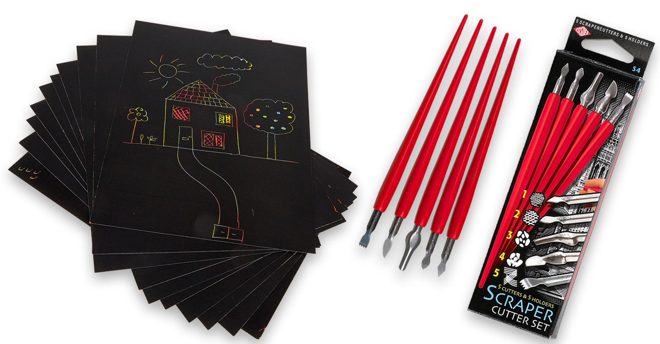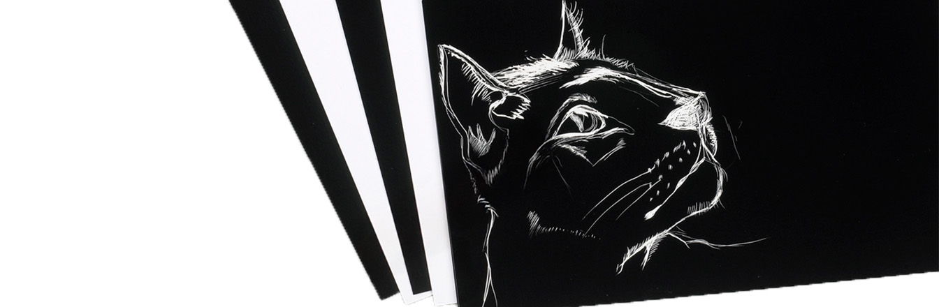 Scraperboard is a sandwich of stiff backboard, hard white China clay and a surface of Indian ink. It is a ready-to-use medium, the appropriate cutter scratching or scraping through the surface produces a clear and clean white line or shape.