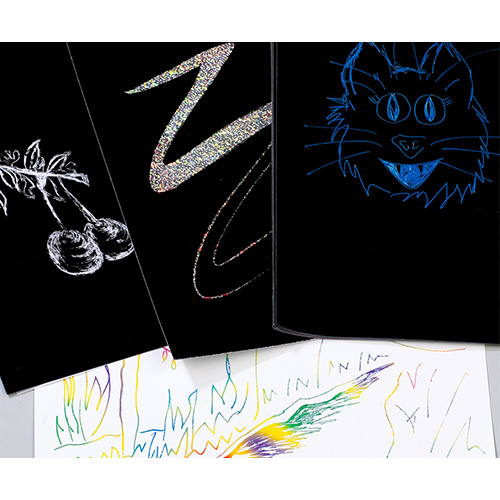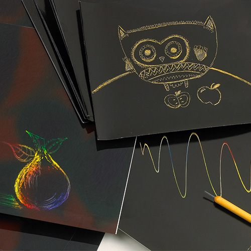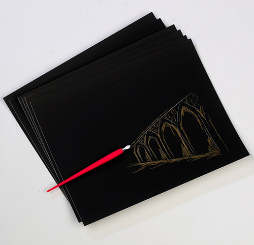 Another way of adding colour is to use multicoloured scratch paper or scratch light film which, when scratched away, expose the transparent and blended colours beneath. Once designs are completed, they can be displayed as window decorations or combined with internal lighting, and the designs will ‘glow’.