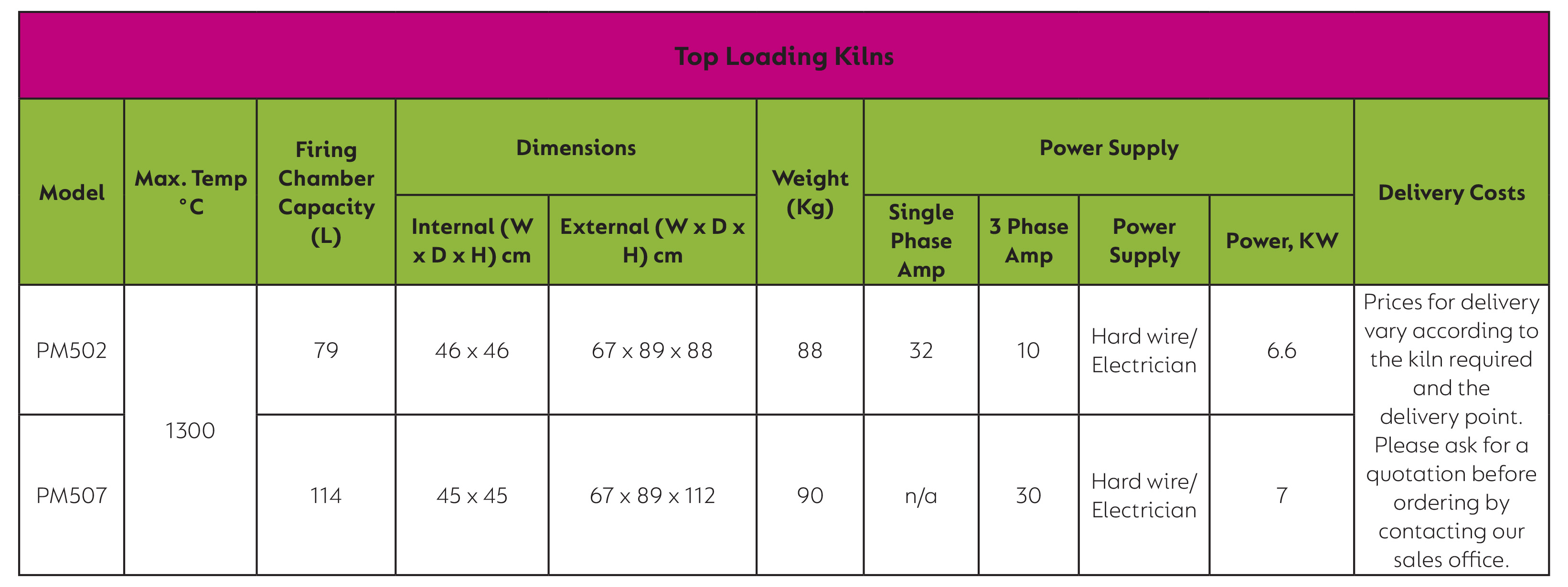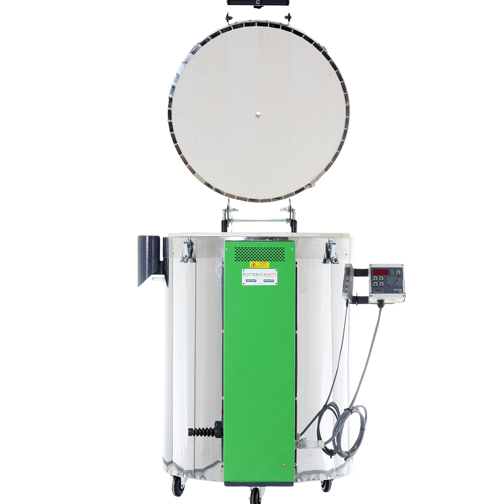 Front loading kilns are supplied with a 10 program controller; top loading kilns are supplied with either a 2 program 9 segment controller (PM725 only) or 9 program controller. Both allow you to program your own firings but the 10 program controller arrives pre-programmed. Each kiln comes with one set of kiln furniture. Kiln cages can be ordered upon request.