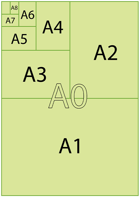 The international 'A' size of paper is based on a square metre (or a million square millimetres) of paper cut in the proportionally balanced shape of 841x1188mm. This is called A0 size and each successive number indicates the halving of the longer side.
