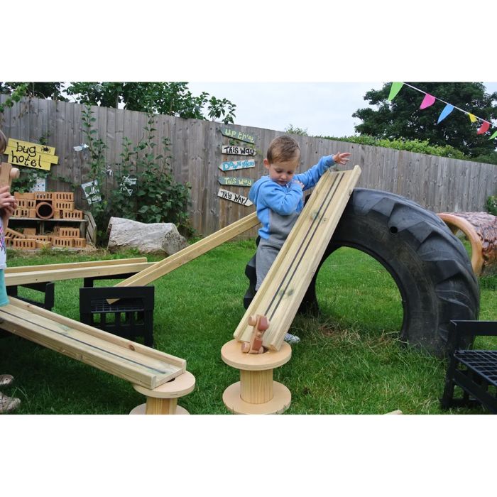 READY, SET, GO, Who's car will win the race, which colour ball rolls the fastest? Build a race rack using all the components inside the kit. This 5 piece set of lipped wooden planks have lines printed in the centre so you can create you very own race track. This great resource can be used either with all the other components or use alongside other products such as tuff trays, other wood planks and many other outdoor construction pieces. Design and create structures of all types, make pathways, roads, bridges to move vehicles and roll balls or use alongside small world to create towns and cities, whatever you design this kit will provide hours and hours of fun.