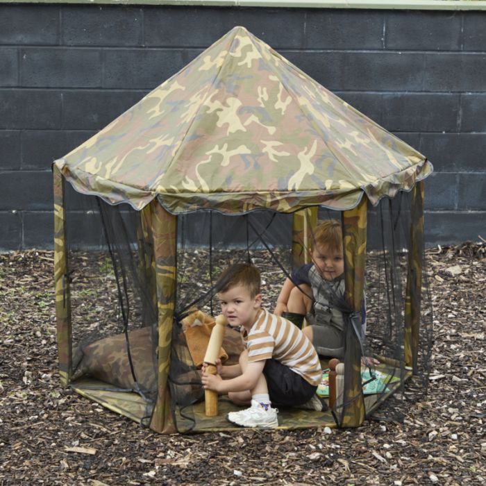 Camouflage printed fabric: Adds an exciting visual element that blends beautifully into garden spaces while enhancing outdoor role play opportunities.