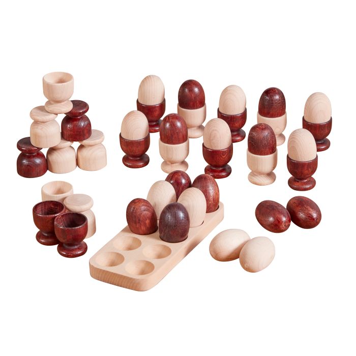 Each set comes with 20 eggs and holders half in light wood, half in a cherry tone for twice the learning fun.