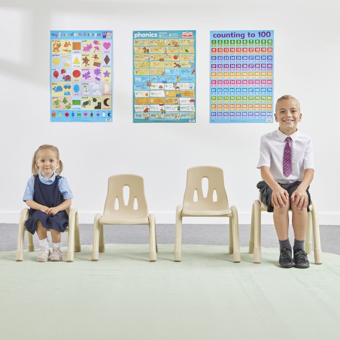 Great value stackable metal framed classroom chairs that are lightweight, robust and practical. The plastic moulded one piece ergonomic seat and back are designed for correct seating posture and have plastic feet to prevent scratching. 3+ years. Available in 3 sizes.| Delivered assembled in packs of 4.