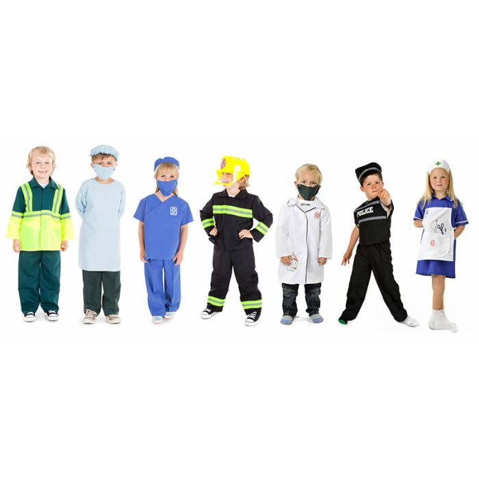 7 realistic costumes for role play fun: This set includes detailed uniforms for key emergency roles-police officer, fireman, paramedic, surgeon, doctor, and nurse.