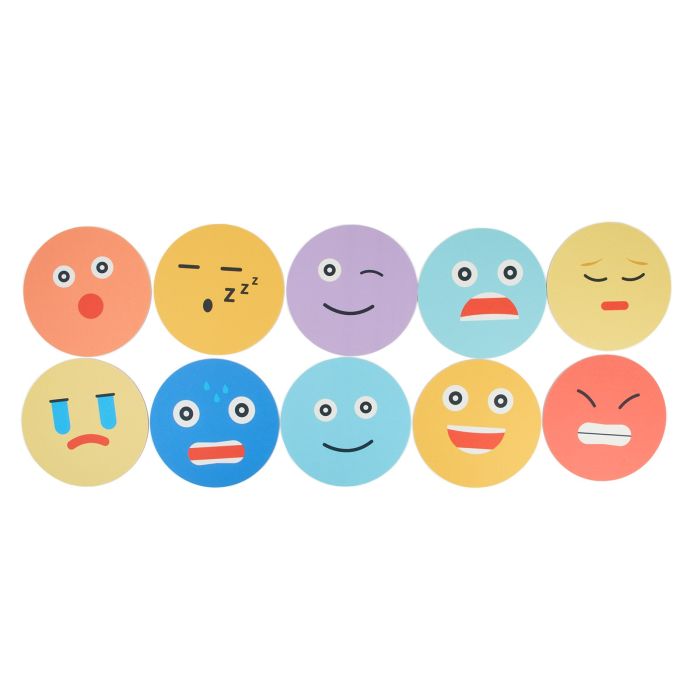 Ideal for group and individual work, this pack of 10 sturdy mat each has an emotive 'emoji' face to help children identify how they feel. Includes happy, sad, angry, sleepy, shocked, worried, laughing, winking, crying and scared faces.