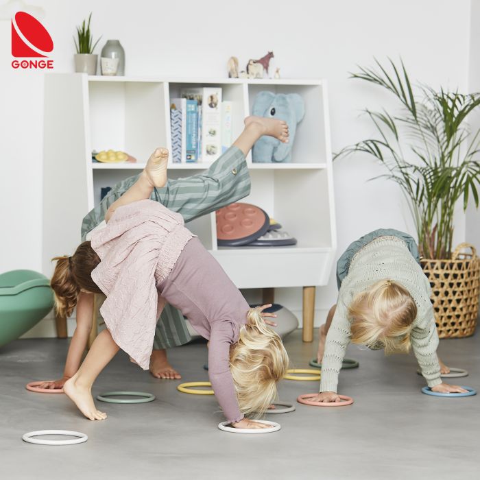 Activity Rings can be used as inspiration for countless activities such as dancing in a circle, walking on tiptoe in the rings, balancing the rings on your head, juggling rings on arms and legs, throwing rings to each other, jumping with rings around your legs, building figures – the combinations are limitless. The rings can be used in both spontaneous and structured activities during play, rhythmic and gymnastics. The rings can be used for individual and social activities.