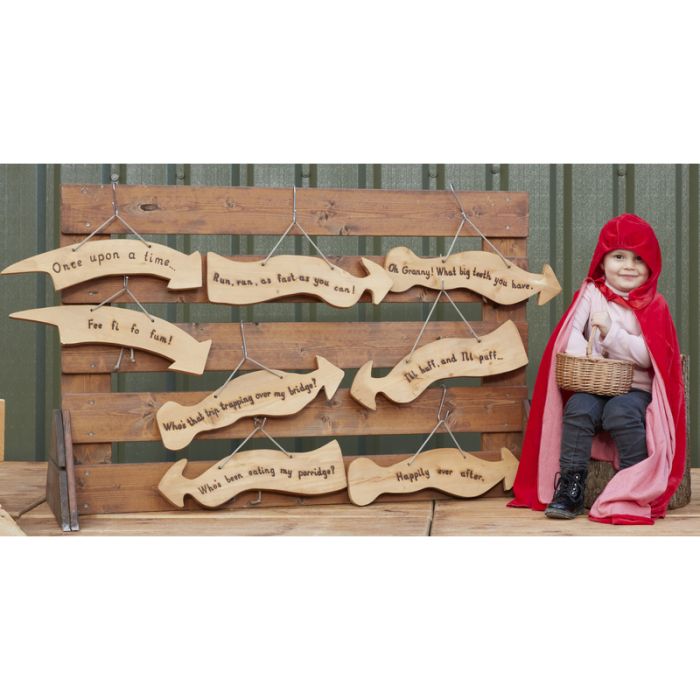 Pack of 8 signs with engraved fairy tale phrases: Each sign is beautifully engraved with well-known phrases from beloved fairy tales, offering a charming and visually engaging way to promote literacy and storytelling.