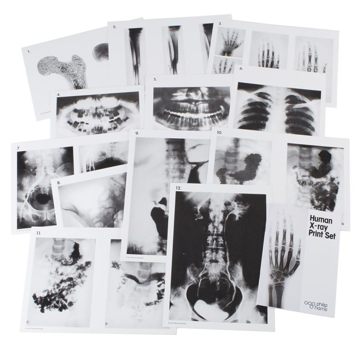 Set of 23 X-ray prints on 12 sheets. Look at bone growth in the hand, how a fractured leg heals, follow food along the intestine and see how teeth develop. Special techniques even show up the stomach, blood vessels and other internal organs. Includes an X-ray of a broken leg.