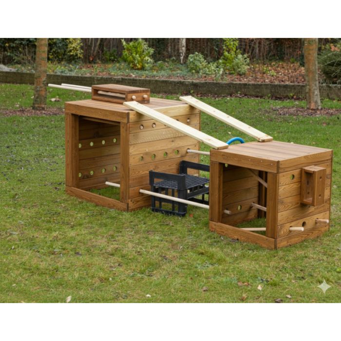 Pre-drilled for loose parts, these sturdy cubes make great bases for outdoor construction fun.