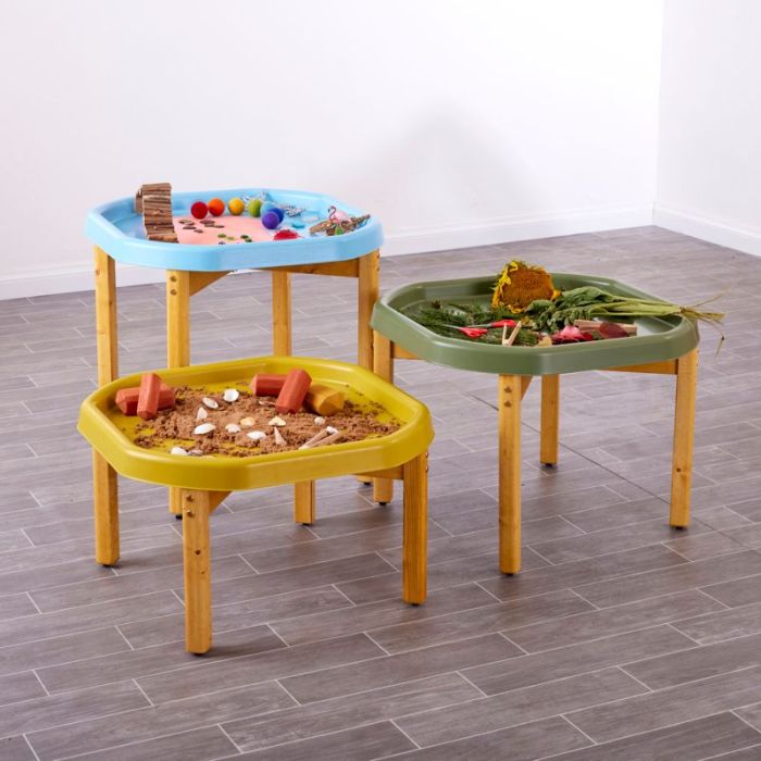 Each set includes three of our popular mini tuff trays alongside robust wooden stands to place them on, with each tuff tray measuring at 70cm diameter.