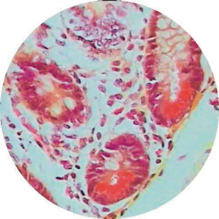 Liver, pig v.s. with well-defined lobules and Glisson's capsule, triple stain.