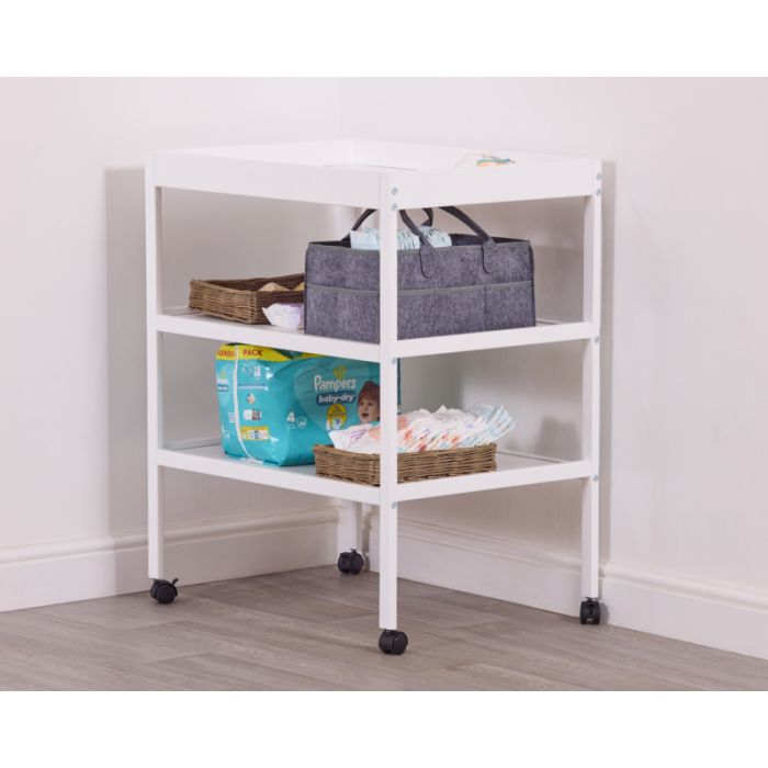 A practical and stylish solution for nappy changes. This mobile changing unit features smooth, lockable castors for easy movement and open shelves for convenient access to essentials. Finished in a clean white tone, it fits beautifully into any nursery or early years setting.
