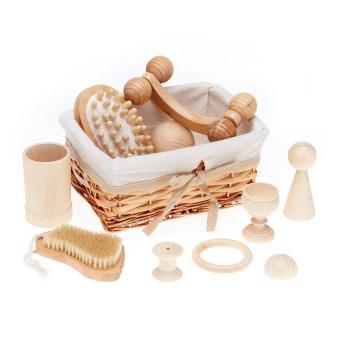 Treasure baskets are an effective tool in the play and development of children. This basket consists of different natural kinds of objects and receptacles for the child to play freely with.