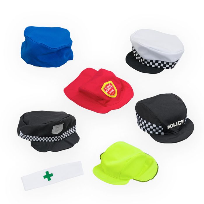7-piece hat set for community helper role play: firefighter, traffic police, traditional police, police cap, medical theatre cap, crossing patrol, and nurse headband.