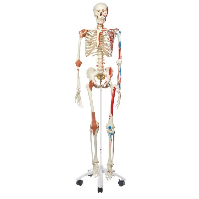 Sam skeleton demonstrates the movements of the skull via the head joints, and fully flexible spine, you can adjust the model to place it in natural body postures. The unique combination of muscle origins and insertions, the numbered bones, flexible ligaments and flexible spine with a slipped disc between the 3rd and 4th lumbar vertebrae clearly the show medical and anatomical interest of this top model's more than 600 structures.