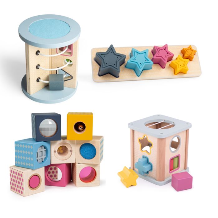 Tots senses are stimulated through touch sight and sound - the sensory blocks are made from smooth wood and child-safe lacquers so are also ok for taste and smell purposes!