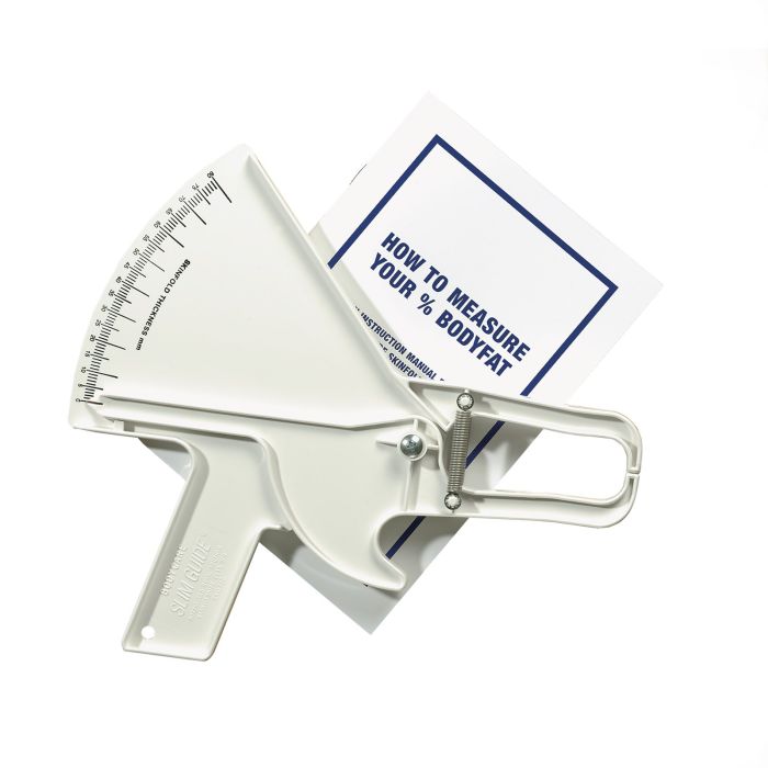A skin fold calliper is a device which measures the thickness of a fold of skin with its underlying layer of fat. By doing this at key locations it is possible to estimate the total percentage body fat of a person.