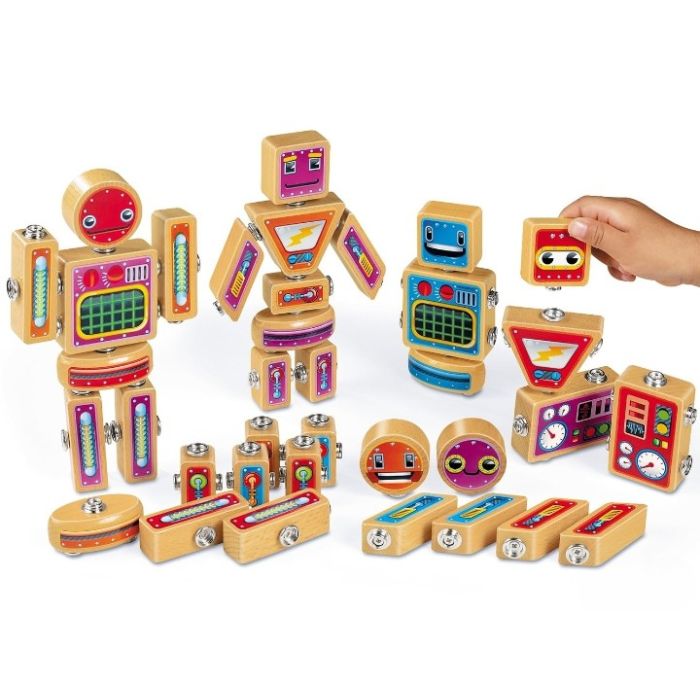 With 36 interchangeable pieces across 9 funky shapes, children can build and rebuild endless robot combinations, each with its own personality and purpose (even if that purpose is just to spin around dramatically and fall over).