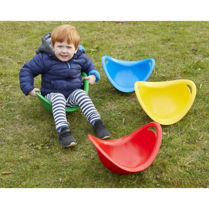 Not only does this spinner develop balancing skills & core strength, but it is also a great calming tool for children that need vestibular input as they can rock back and forth. On top of that, fill it with sand or water, carry stuff in it, or throw balls or bean bags into it. Colours will vary in what you receive. Age 1+ years. H34cm x W34cm x D22cm. Supervision recommended.