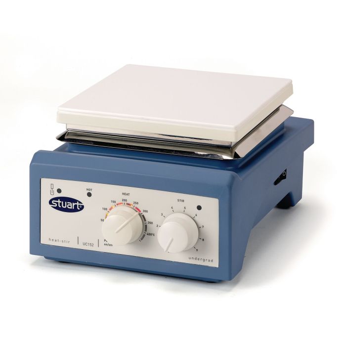 Model UC152 has a glass ceramic top which has excellent chemical resistance. The surface is easy to clean and the thermal properties allow very high plate temperatures while ensuring the edges stay cooler, reducing the chance of accidental burns. The white surface ensures good visibility of colour changes. The hot plate has an innovative LED temperature indicator scale and can also be used in conjunction with the SCT1 digital contact thermometer to accurately control sample temperature.