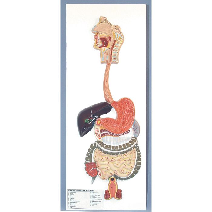 Representation of the nose, mouth cavity and pharynx, oesophagus, the gastrointestinal tract, liver and gall bladder, pancreas and spleen. Duodenum, cecum and rectum are opened. The transverse colon is removable. Mounted on a board and numbered with key card.