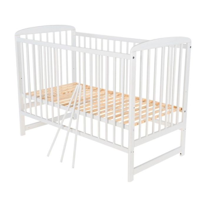 Beautifully crafted from high quality pine wood with a smooth white finish, this elegant cot is designed for both style and function. Featuring a 3-level adjustable base, 3 removable side pins for easy access, and a bottom reinforcing strip for added stability. Built to meet European standard EN 716-1:2017. Fits a 1200mm x 600mm mattress.