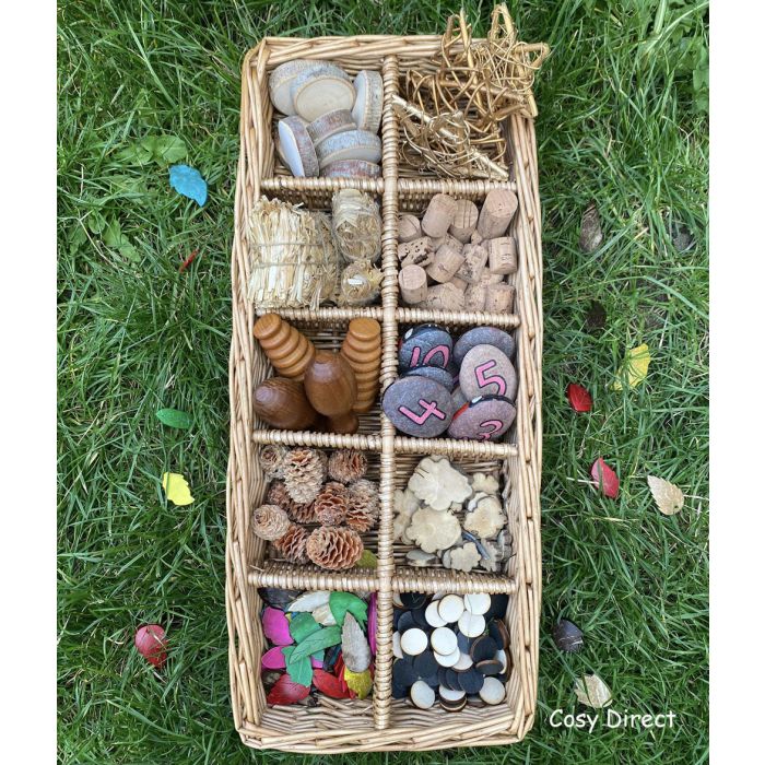 This tens frame basket is perfect for sorting your natural pine cones or coloured balls into tens frame patterns to allow children to calculate numbers to ten. H7cm x L50cm D21cm Recommended ages 3+. Contents not included.