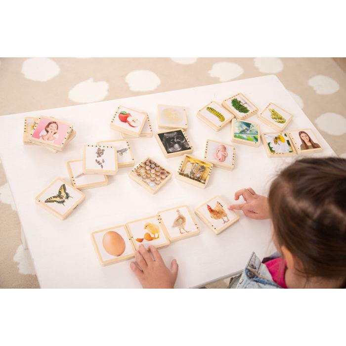 24 smooth birch plywood square tiles, clearly colour printed on one side with real photographic lifecycle images. Showing 4 stages for each lifecycle, the self-correcting tiles illustrate the growing and development process of humans, bees, frogs, apples, butterflies and chickens. Perfect for teaching children to understand the concept of lifecycles, and how different species are similar and different during their lifecycle process. The tiles are self-correcting, so children can easily sort into species groups and learn to identify each stage. The set comes with a cotton bag and an identification guide in 8 languages with details on each stage of every cycle.