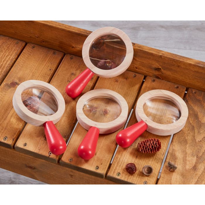 Large wooden magnifying glasses with 2x magnification plus inset lens with 3x magnification. Excellent to develop observation skills and inspect mini beasts or flowers up close. 12 mths+. Size: 1 cm. Supervision recommended.