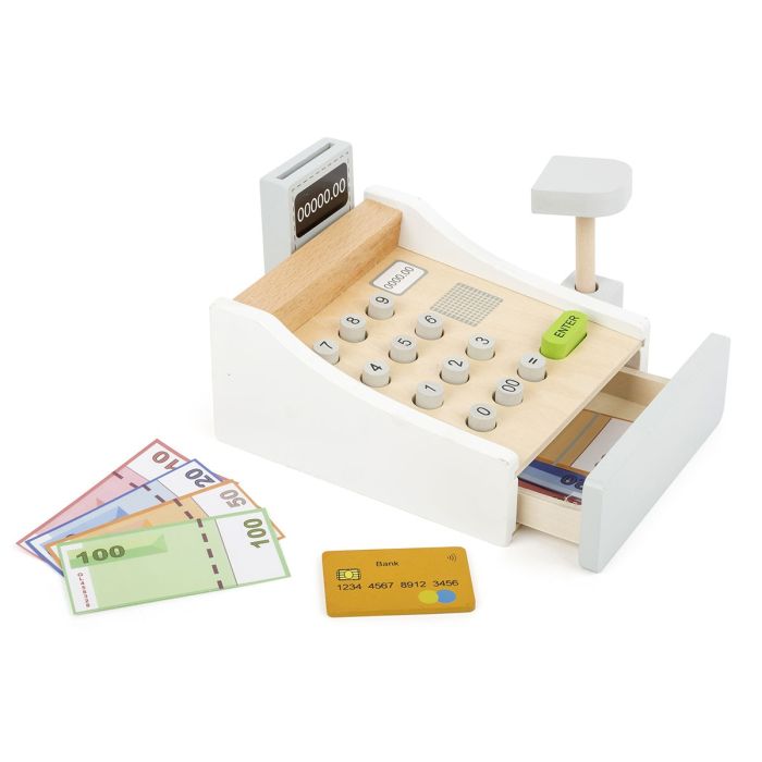 Wooden till with scanner and card reader. Beep.